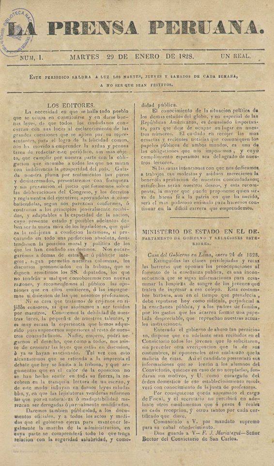 La Prensa Peruana (1828). Los editores. La Prensa Peruana, 1(1), 1.