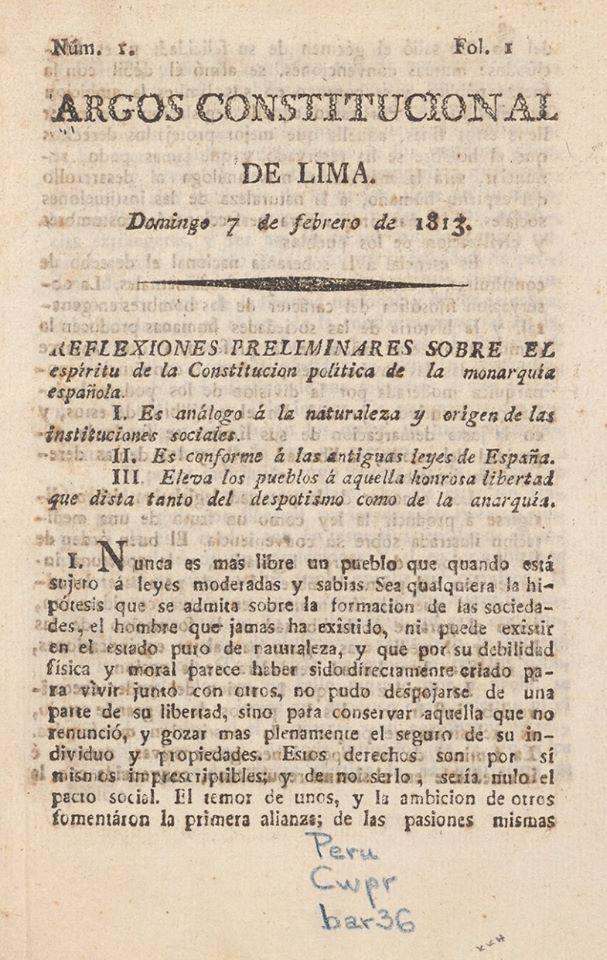 Muy á costa del género humano ha demostrado la experiencia de todos los siglos y de las pasiones del hombre, que no pueden subsistir justicia y libertad, ni prosperar el estado, adonde un solo jefe revestido de la suma de los poderes, y armado con la fuerza pública, no tiene otro freno para oponerse al bien de todos, que el de su propio deseo (Argos Constitucional de Lima, Lima, 21 de febrero de 1813, p. 20).