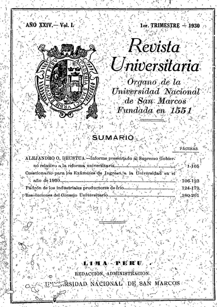 Órgano oficial de la Universidad de San Marcos, fundado por el rector Luis Felipe Villarán en beneficio del «comercio continuo de las ideas y la propagación amplia y oportuna do los documentos y trabajos destinados á ver la luz pública por orden de la Universidad» (Revista Universitaria, Lima, vol. 1, nro. 1, mayo de 1906, p. 1). Fue publicado en dos épocas: la primera, entre 1906-1920 y 1922-1930, y la segunda entre 1935-1937 y 1939. Sucedió y a la vez fue sucedido por los Anales de la Universidad de San Marcos (Lima, 1862-1906, 1949-1960).