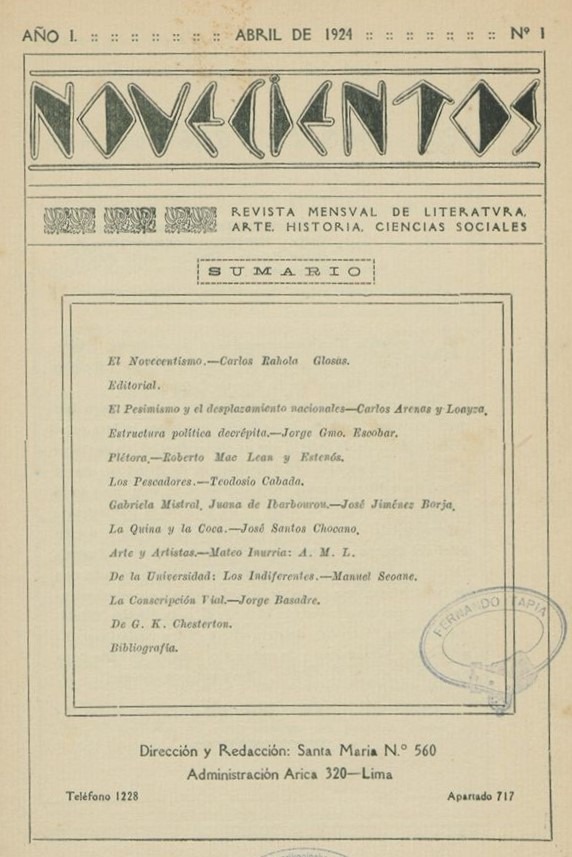 «Revista mensual de arte, literatura, historia y ciencias sociales» publicada en Lima entre abril y octubre de 1924 (7 números). Fue dirigida por José León y Bueno. La alarma del extremismo de algunos sectores estudiantiles (con el 1919 como año central) generó en la propia juventud de la Universidad San Marcos un destello de reivindicación católica, lo cual conllevó a la fundación de Novecientos. En sus páginas aparecieron nombres como José Santos Chocano, Jorge Basadre, Manuel Seoane, Emilio Romero, José Jiménez Borja, entre otros.