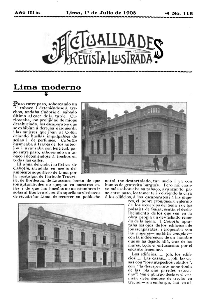 Revista semanal fundada y dirigida por el periodista arequipeño Juan José Reinoso, aunque también pasaron por la dirección Octavio Espinoza y Andrés A. Aramburú Salinas. Junto con Prisma, Variedades, Lulú, Mundial y otros, forma parte del grupo de revistas ilustradas limeñas más importantes de las primeras décadas del siglo XX. Publicó su primer número el 3 de enero de 1903, editándose hasta el 22 de agosto de 1908 (275 nros.). Insertó información sobre la realidad social y cultural limeña, moda, teatro, inserciones poéticas y literarias, moda, turf, toros, mundo femenino, caricaturas, entre otras producciones. Como señala María Mendoza Michilot (2016) en su estudio sobre los 100 años del periodismo en el Perú: