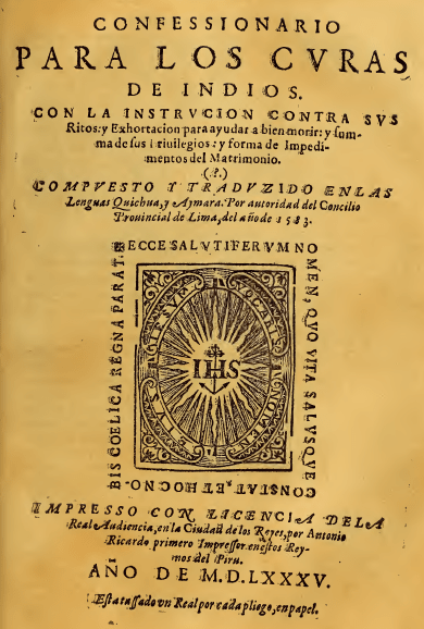 Tercer Concilio Limense (1585). Confessionario para los cvras de indios. Con la instrvcion contra svs Ritos; y Exhortacion para ayudar a bien morir; y summa de sus Privilegios; y forma de Impedimentos del Matrimonio. Compvesto y tradvzido en las lenguas Quichua, y Aymara: Por autoridad del Concilio Provincial de Lima, del año 1583. Lima: Por Antonio Ricardo.