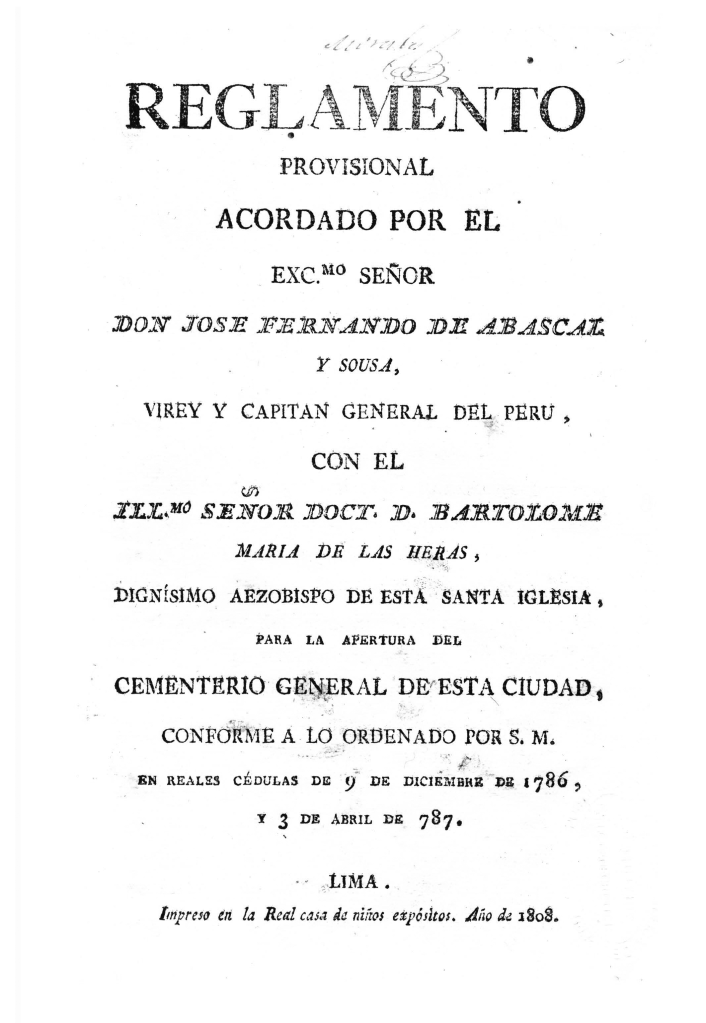 Abascal, José Fernando (1808). Reglamento provisional acordado por el excelentísimo señor Don José Fernando de Abascal y Sousa, Virey y Capitán del Perú, con el Ilustrísimo Señor Doctor Don Bartolomé María de las Heras, dignísimo aezobispo de esta Santa Iglesia, para la apertura del Cementerio General de esta ciudad, conforme a lo ordenado por Su Majestad en reales cédulas de 9 de diciembre de 1786, y 3 de abril de 1787. Lima: Imprenta Real de los Niños Expósitos.