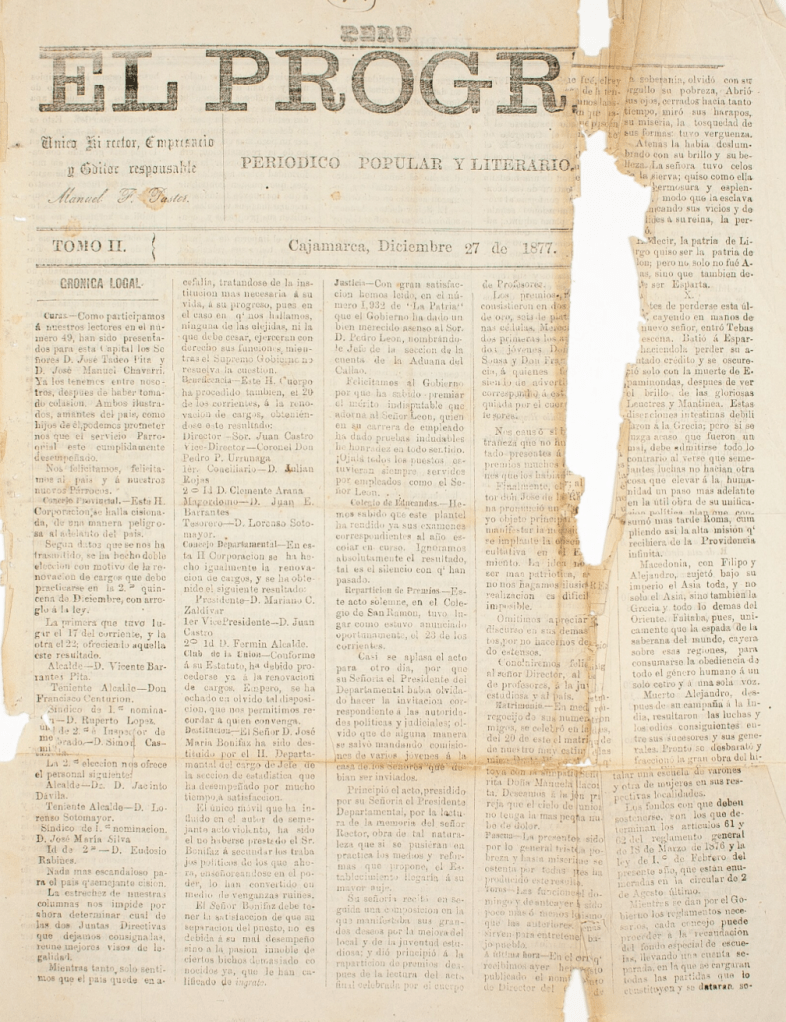 “Periódico popular y literario” cajamarquino aparecido en 1877 bajo la dirección y edición de Manuel F. Pastor. Según Tristán Ravies Sánchez (1999, p. 51), entre sus colaboradores figuraron Pedro Centurión, Germán Leguía y Martínez, José María Arana y Juan Pío Burga. La imprenta de este semanario fue inaugurada en 1874 y destruida el 17 de marzo 1878 por las fuerzas gobiernista, por lo que debió publicar su último número poco antes de dicho acontecimiento. El ejemplar digitalizado por la British Library (27 de diciembre de 1877, deteriorado) incluye un “Cuadro que manifiesta el resultado de los exámenes del presente año escolar en el Colegio Departamental de San Ramón de esta ciudad”, el cual da luces del plan de estudios de la institución, entre otras noticias locales e inserciones literarias.