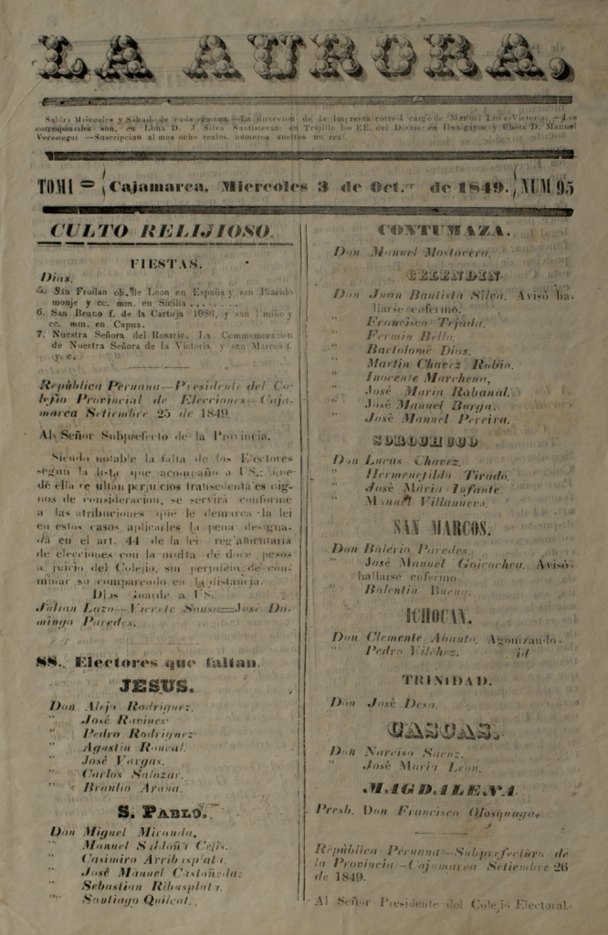 Segundo periódico impreso en Cajamarca, dirigido y redactado por Manuel Luna Victoria (primer impresor de la región) y Mariano Felipe Paz Soldán. Su primer número salió a la luz el 4 de noviembre de 1848 bajo el nombre de La Aurora: Bisemanario cultural y político. Cabe mencionar que Paz Soldán (1879, p. 5), en su Biblioteca Peruana, consigna a La Autora, erróneamente, como “el primer periódico que se publicó en el Norte del Perú” (1879, p. 5). El primero fue Volcán Termal (Cajamarca, 1847).