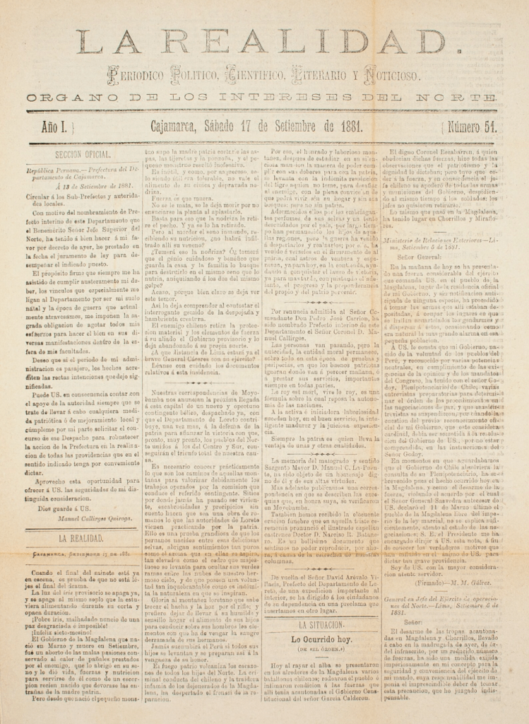 “Periódico político, científico, literario y noticioso” y “órgano de los intereses del norte” cajamarquino publicado entre de marzo y noviembre de 1881, cuando Lima y el sur peruano se encontraban bajo la autoridad chilena. Fue fundado y dirigido por Abelardo Gamarra “El Tunante” (quien insertó varios de sus artículos costumbristas y poemas patrióticos) y editado en la Imprenta de la Municipalidad, administrada por Braulio Basauri. Sus páginas estuvieron destinadas a afirmar la resistencia encabezada por el general Andrés A. Cáceres, exaltando el patriotismo, difundiendo los comunicados de guerra y movilizando a los pueblos frente al avance chileno.