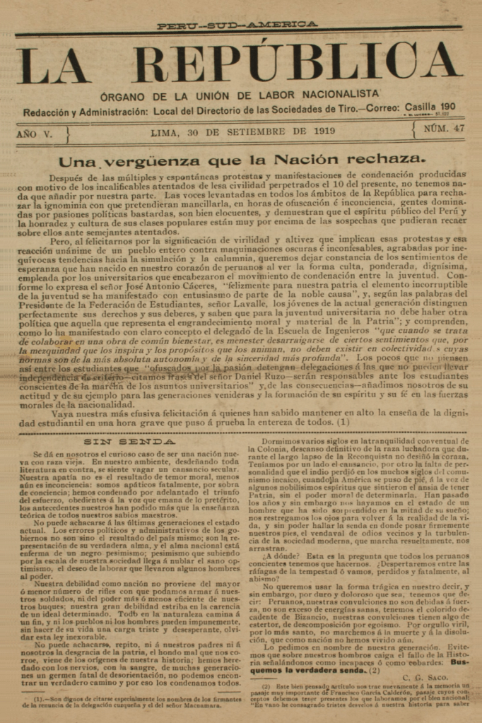 Órgano de la “Unión de Labor Nacionalista”, sociedad de estudios sociales y de orientación cívica. Para 1919, su director general era el ingeniero Enrique E. Silgado, acompañado en la administración por personas como Teodoro y Edwin Elmore, Pedro Morales de la Torre, Carlos A. Valcárcel, entre otros (Unión de Labor Nacionalista, 1919, pp. 45, 49). La República publicó su primer número el 4 de enero 1915, editándose al menos hasta 1920.