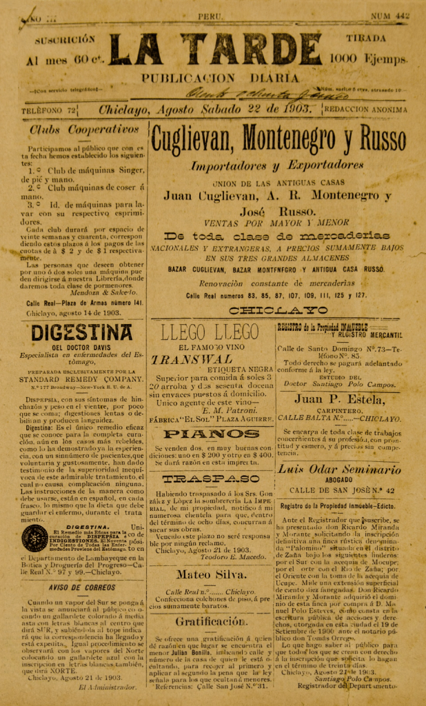 Periódico chiclayano de redacción anónima, de propiedad de Virgilio R. Pérez (dueño de la Imprenta Comercial en la Plaza de Armas de Chiclayo) y dirigido por Víctor Manuel Vélez G. Fue sucesor de La Enseña Ciudadana (Chiclayo, 1899-1901). Su primer número apareció el 11 de abril de 1901, siendo premiado en un concurso del 28 de julio de 1910 por el Concejo Provincial de Chiclayo. Tuvo tres formatos y llegó a publicar un tiraje diario de 2000 ejemplares. En 1911, a causa de su postura política, fue clausurado por siete meses. Luego, en 1920, los partidarios de Augusto B. Leguía empastelaron sus talleres. Según indica Jorge Zevallos Quiñones (1947, p. 36), La Tarde revivió posteriormente, aunque con muy corta vida.