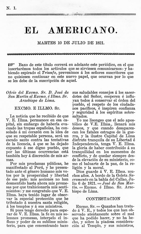 Periódico editado en Lima por Guillermo del Río entre el 10 y 14 de julio de 1821 (3 números), pocos días después de que el virrey José de La Serna y las tropas realistas evacuaran de la capital. Contiene correspondencias y proclamas de José de San Martín, así como una «canción encomiástica» al libertador por la Municipalidad de Buenos Aires. Fue reemplazado por Los Andes Libres (Lima, 1821). Juan Pedro Paz Soldán realizó una reedición completa del periódico en 1821.