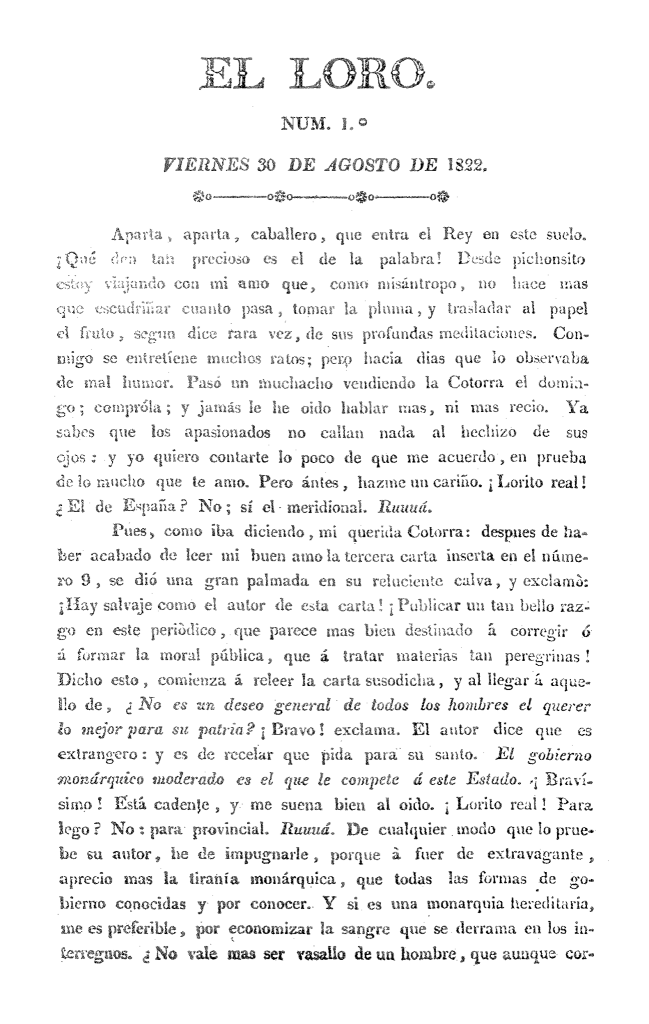 Publicación periódica publicada en Lima entre el 30 de agosto y 4 de octubre de 1822 (6 números), editado en la imprenta administrada por J. Antonio López. Junto con La Cotorra (Lima, 1822-1823) y El Periquito (Lima, 1822) forman una trilogía jocosa muy característica del ambiente politiquero de la Lima de 1822. Sus primeros números atacaron el monarquismo propuesto por José de San Martín como modelo de gobierno, aunque luego se pronunció a favor de un ejecutivo constituido por varias personas. Ofrece también algunos esclarecimientos sobre la incorporación de Guayaquil a la Gran Colombia.