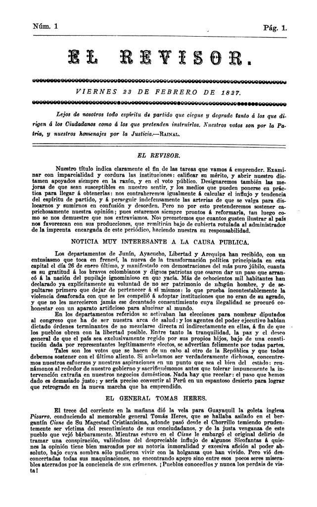 Semanario político editado por Manuel Lorenzo de Vidaurre entre febrero y mayo de 1827 (9 números), aparecido a raíz de la reacción antibolivariana que estalló en Lima entre el 26 y 27 de enero de dicho año, de la cual fue partícipe. Sus páginas contienen críticas a la constitución vitalicia, registros de la mencionada reacción, los proyectos que se forjaron contra el régimen bolivariano, y demás. Fue impreso en los talleres de la Imprenta del Estado, administrada por J. Gonzáles.