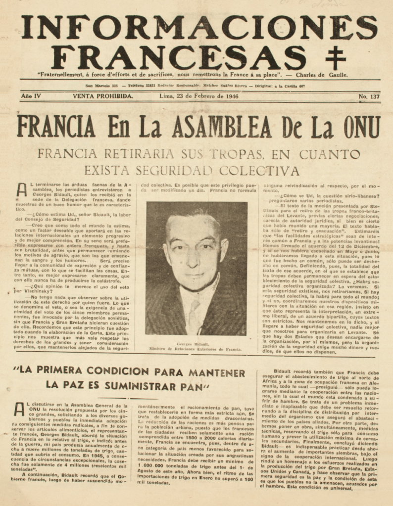 El ejemplar digitalizado por la British Library (23 de febrero de 1946) contiene información referente a Francia; acerca de las relaciones económicas y diplomáticas entre dicho país y el Perú; una nota sobre la “Exposición de la prensa francesa en el Perú”, próxima a realizarse, entre otras informaciones.