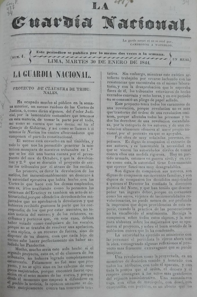 Publicación bisemanal de corte político aparecida entre enero y junio de 1844 en la ciudad de Lima (37 números). Editado por Felipe Pardo y Aliaga, su redactor casi exclusivo, tuvo como objetivo apoyar la imagen del general Manuel Ignacio Vivanco, quien desde 1843 había asumido las riendas del país. En este sentido, su nombre hace referencia a las milicias que, durante el Directorio (apelativo con el cual se conocía al régimen vivanquista), tuvieron un desarrollo dinámico. Por otro lado, sus páginas ridiculizan a los generales Domingo Nieto y Ramón Castilla, rivales de Vivanco en el contexto de la guerra civil peruana de 1843-1844. Así, en consonancia con el proyecto directorial, el discurso que desarrolló la publicación fue de corte conservador, con una añoranza al pasado virreinal.