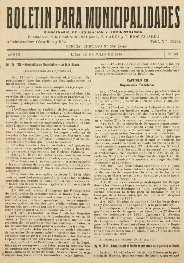 “Quincenario de legislación y administración” publicado en Lima, de 4 a 6 páginas. Fue fundado el 1 de octubre de 1931 por L. E. Gadea y T. Ríos Fajardo. Se publicó al menos hasta 1934. Sus páginas insertaban información de interés para las municipalidades del interior del país, principalmente legislación, siendo los ejemplares remitidos previa subscripción.