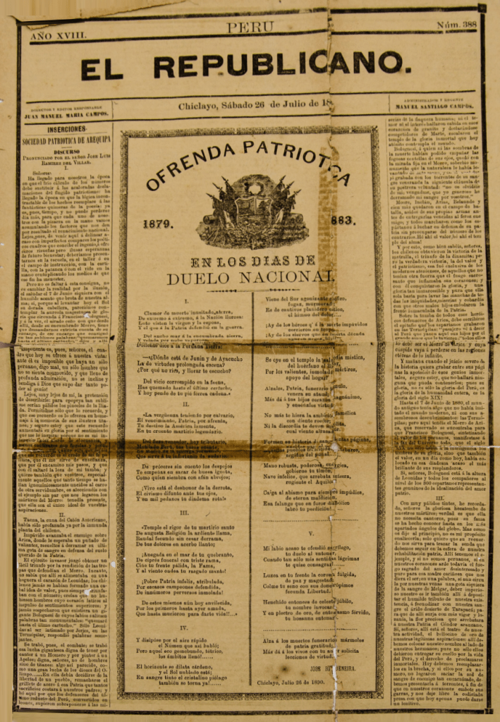 Otra nota, titulada “Partido Constitucional” (Año XXI, 14 de enero de 1893), inserta información respecto a la reorganización de la Junta Directiva del Partido Constitucional (fundada por Andrés A. Cáceres) en el distrito de Monsefú, manifestándose en contra de la Unión Cívica y de sus pretensiones políticas. Por otro lado, en el artículo “Cuba libre” ([31 de marzo de 1896], deteriorado) encontramos una reflexión conmemorativa respecto a la guerra de independencia cubana. Otro texto (Año I, nro. 259, 6 de agosto de 1900, deteriorado) nos brinda información respecto a la Liga de Librepensadores, primera organización anticlerical del Perú, que realizó su primera conferencia en Chiclayo.