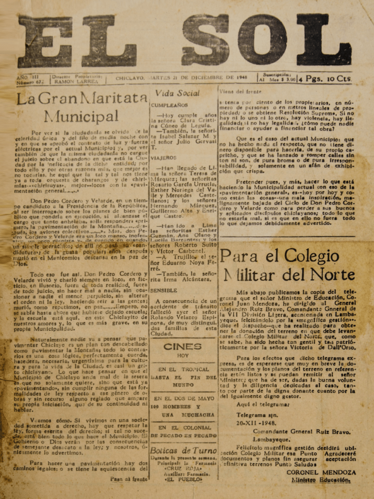 El ejemplar digitalizado en la British Library (Año III, nro. 672, 21 de diciembre de 1948) contiene información variada, como se sigue a continuación. Primero, una nota titulada “La Gran Maritata Municipal” que critica la gestión municipal en relación a la pavimentación en Chiclayo. Segundo, en el artículo “Para el Colegio Militar del Norte” encontramos un telegrama que el Ministro de Educación el coronel Juan Mendoza le remite al comandante General Alejandro Ruiz Bravo, felicitándolo por su buena gestión para obtener el terreno donado por Victoria Dall´Orso para erigir el Colegio Militar del Norte. Por último, encontramos una nota titulada “La Batalla contra la Especulación”, la cual informa sobre la contienda que libran las autoridades contra los comerciantes locales, pues se puso al descubierto las formas ilícitas en que se enriquecen ciertos ambulantes con la especulación de precios.