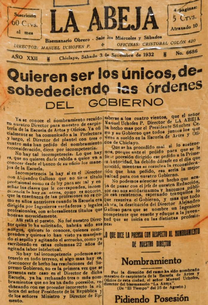 El ejemplar digitalizado en la British Library (Año XXII, nro. 6686, 3 de setiembre de 1932) contiene información sobre el reciente nombramiento de Uchofen como maestro de carpintería de la Escuela de Artes y Oficios de Chiclayo y el pedido de “reconsideración” solicitado por el director del establecimiento.