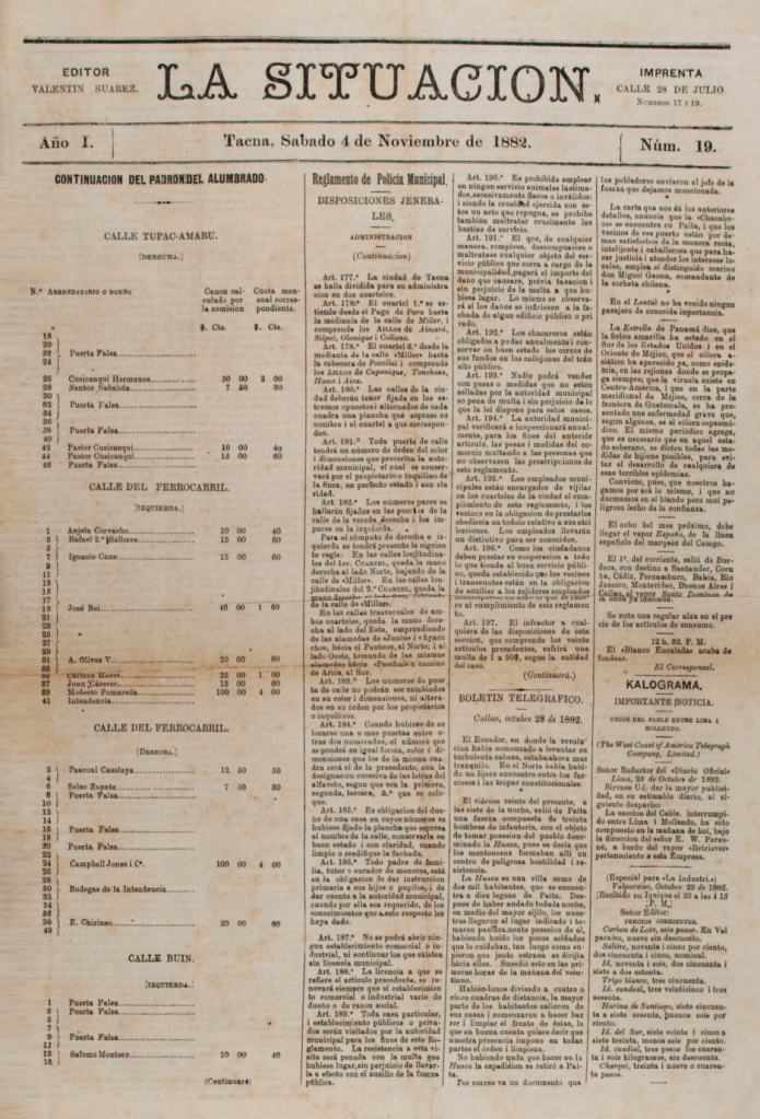 Publicación periódica aparecida en Tacna en 1882 en el contexto de la Guerra del Pacífico. Tuvo una periodicidad trisemanal, apareciendo los días martes, jueves y sábado. Fue editada por Valentín Suárez en la Imprenta de “La Situación”. Publicaba noticias locales e internacionales, asimismo reproducía dispositivos oficiales del gobierno de Chile. Fue sucedida por El Tacora (Tacna, 1882-1911).