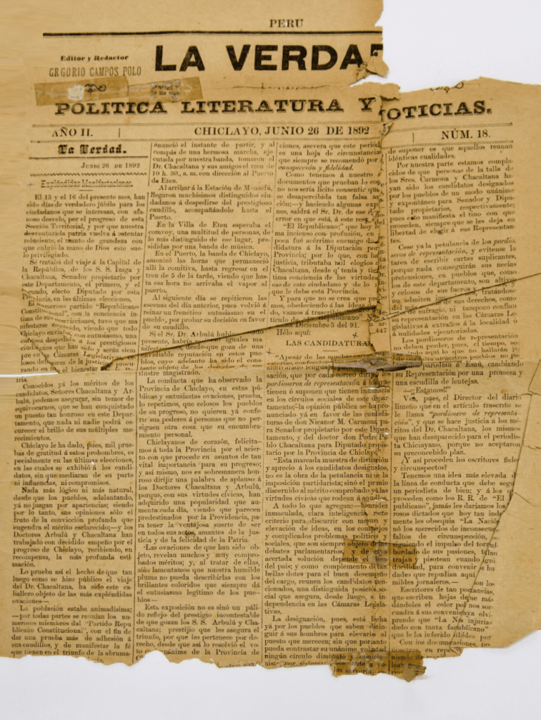 El ejemplar digitalizado en la British (Año II, nro. 18, 26 junio de 1892, deteriorado) detalla información sobre la candidatura de Nicanor M. Carmona para senador de Lambayeque y de Pedro Palo Chacaltana para diputado de Chiclayo. Incluye notas sobre los sucesos de la actualidad y la confrontación de diarios chiclayanos.