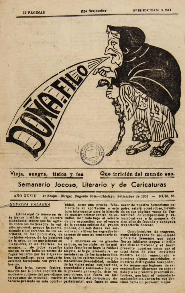 “Semanario jocoso, literario y de caricaturas” publicado en Chiclayo por etapas al menos entre 1926 y 1959, dirigido por Eugenio Sosa Farfán. El ejemplar digitalizado en la British Library (setiembre de 1959) contiene una nota costumbrista titulada “Apellidos con Ají y Cebolla”, escrita por Alfonso Tello Marchena, un intelectual lambayecano que cultivó la poesía, la pintura y el periodismo, en donde describe algunas curiosidades de los apellidos norteños. Resalta también diversos artículos sobre el Colegio Nacional San José de Chiclayo y una semblanza de su director Carl Weiss.