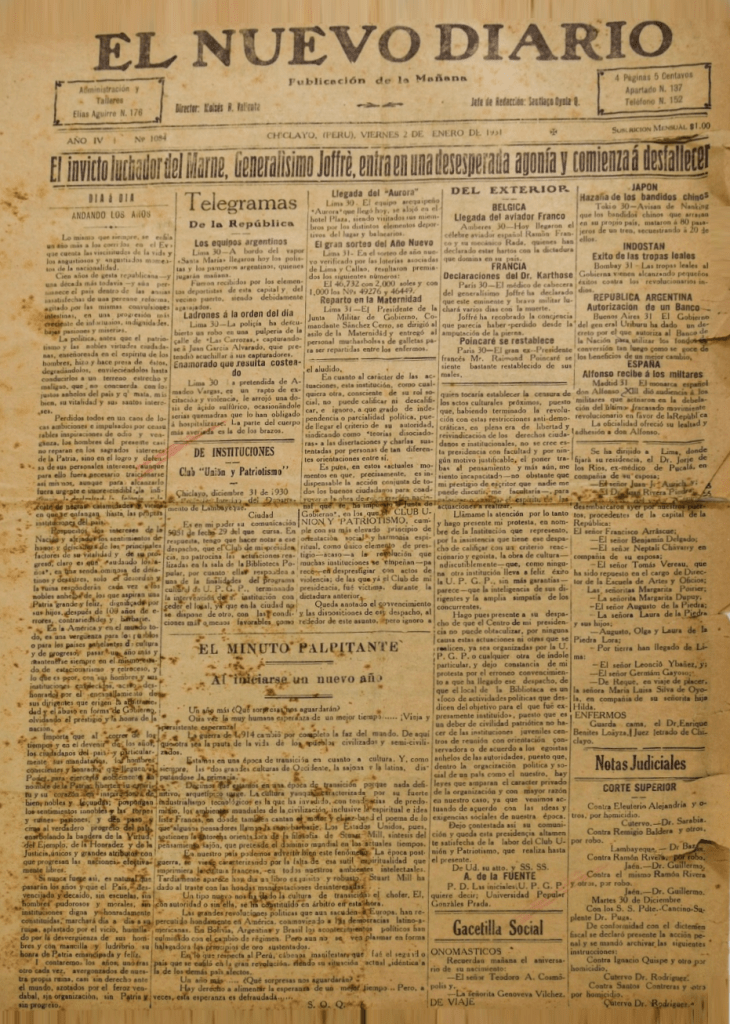 Diario chiclayano publicado entre 1927 y al menos 1931. Tuvo como director a Moisés Valiente y como jefe de redacción a Santiago Oyola. En el ejemplar digitalizado en la British Library (Año IV, nro. 1084, 2 de enero de 1931), encontramos una variedad de noticias, entre reflexiones, telegramas nacionales e internacionales, notas judiciales, anuncios institucionales y publicitarios. Destacan algunas inserciones como: el acta de sesión del 27 de diciembre de 1930 de la sociedad chiclayana de “Amantes de las Artes”; una nota titulada “Andando los años” que comparte una reflexión relacionada a la necesidad de cambios y reformas en el país; otra denominada “El minuto palpitante al iniciarse un nuevo año” que analiza el contexto de transición de postguerra mundial y sus repercusiones en los países latinoamericanos; asimismo, un artículo relacionado al Colegio del Carmen de Chiclayo, que hace énfasis en su posible clausura por rencillas políticas, y la lenta ejecución de obras públicas para la provincia; por último, una información relacionada a la agonía que padece el mariscal Joffre, quien fue jefe del ejército francés durante la Primera Guerra Mundial y participó en la batalla de Marne.