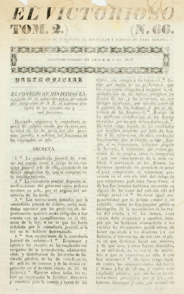 Diario bisemanal publicado en la ciudad de Ayacucho los miércoles y sábados de cada semana. Hizo su aparición entre 1835 y 1837, según anota Lizardo Seiner (2016, p. 19). Sus páginas apoyaron a Andrés de Santa Cruz en el contexto de la lucha por la confederación peruano-boliviana.