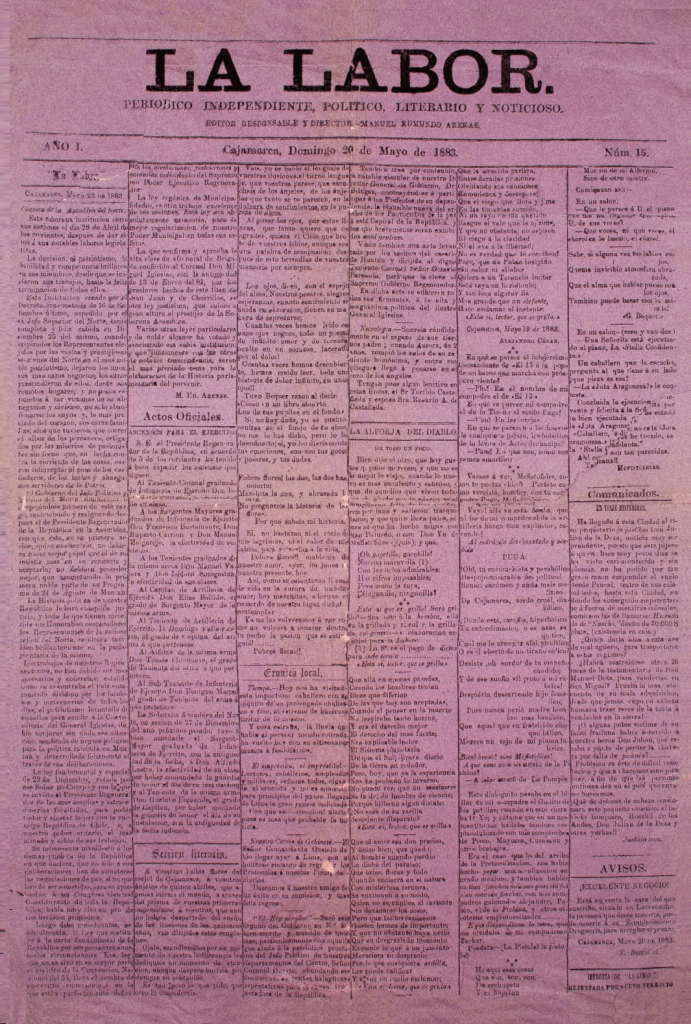 “Periódico independiente, político, literario y noticioso” aparecido en Cajamarca entre 1883 y 1898, dirigido por Manuel Edmundo Arenas. El ejemplar digitalizado por la British Library (20 de mayo de 1883) contiene una nota sobre la clausura de la Asamblea del Norte o Asamblea de Cajamarca, principal brazo de apoyo del gobierno de Miguel Iglesias en el contexto de la Guerra del Pacífico; un listado de ascensos en el Ejército, además de inserciones literarias.