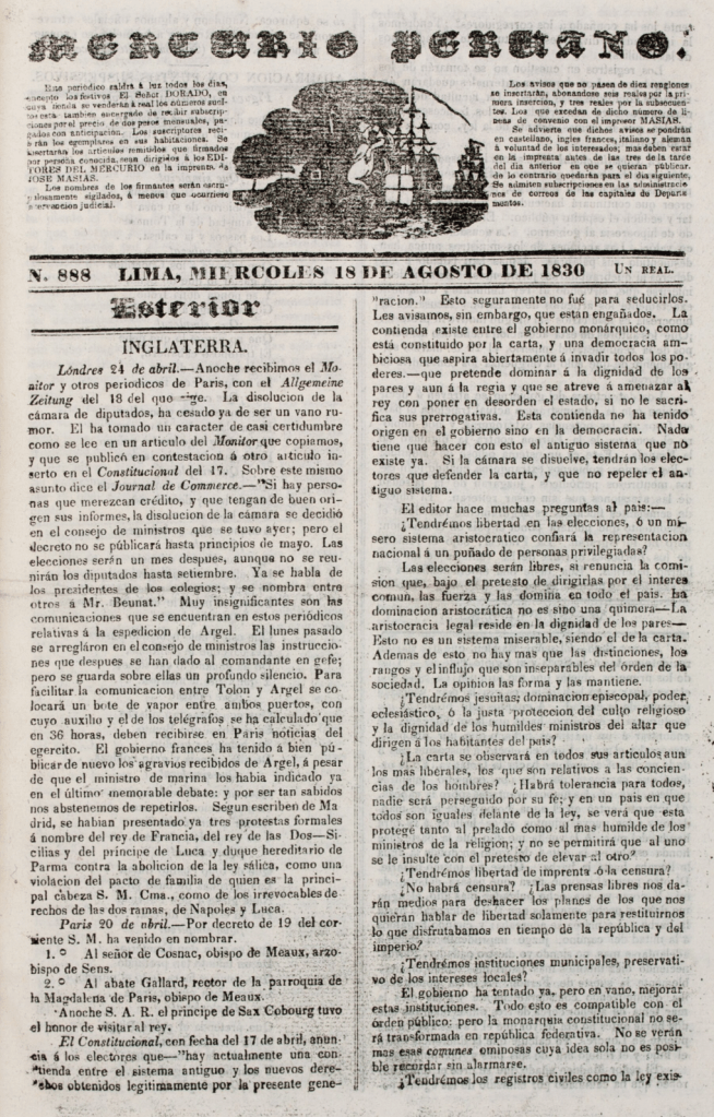 En el caso del diario homónimo que presentamos a continuación, publicó su prospecto el 24 de julio de 1827, anunciando su próxima circulación en la capital. El primer número apareció el 1 de agosto de 1827, dejando de circular el 8 de marzo de 1834 por falta de subscriptores; sin embargo, retomó su circulación por breve tiempo entre el 1 de junio de 1839 y el 2 de enero de 1840. Editado en la Imprenta de José Masías, fue un diario de tendencia moderada conservadora, cuyas páginas reflejaron las alternativas comerciales y políticas de su tiempo. Además, ofrecía importantes noticias sobre los antecedentes y la significación de los personajes coetáneos, interesantes para la reconstrucción biográfica de Francisco Luna Pizarro, Dionisio Vizcarra, Bernardo O´Higgins, Manuel Lorenzo de Vidaurre, Antonio José de Sucre, José María Ayala, entre muchos más (Paz Soldán, 1879, p. 41). En diversos momentos, tuvo entre sus colaboradores a José María de Pando, Felipe Pardo y Aliaga, José Joaquín de Mora y José Pérez de Vargas. El diario insertó básicamente noticias del extranjero (Sección Exterior) y del interior del Perú (Sección Interior), información portuaria (Sección Marítima), correspondencias recibidas por los editores del periódico (Sección Remitidos), notas editoriales (Sección Mercurio), estadísticas, literatura y anuncios publicitarios, además de publicar suplementos cada cierto tiempo.