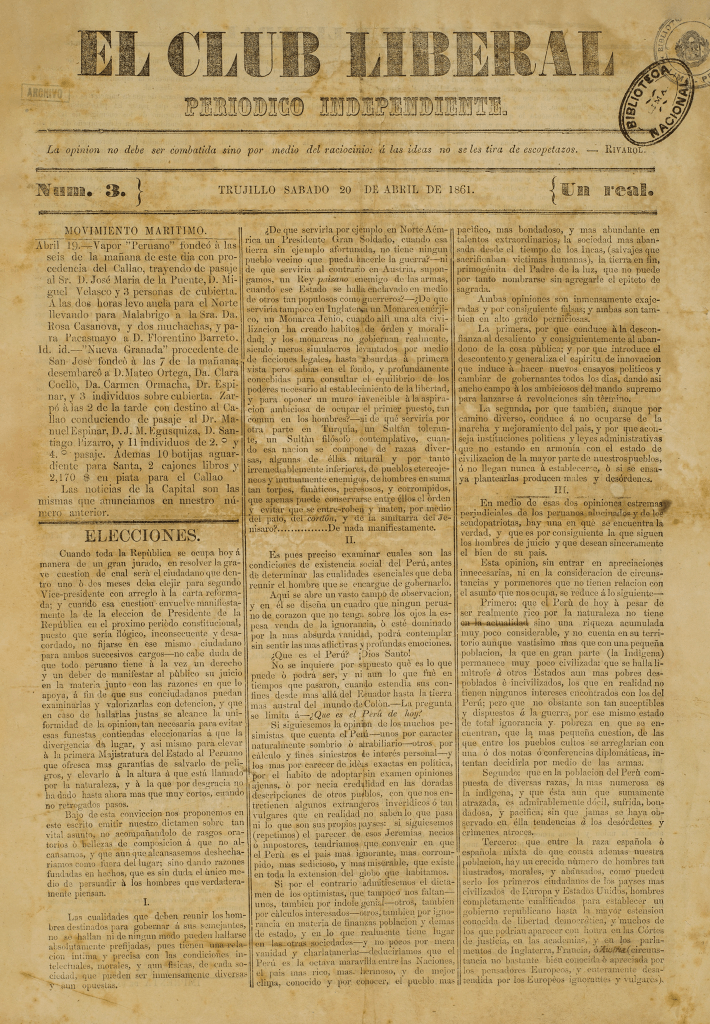 El ejemplar digitalizado por la Biblioteca Nacional del Perú (nro. 3, 20 abr. 1861) está dedicado a sostener la candidatura presidencial del general Juan Antonio Pezet, emitiendo su propio dictamen del porqué se debe elegir a su persona. La totalidad del ejemplar describe las cualidades que debe tener el presidente de la República, siendo considerado Pezet el más indicado. Complementa el análisis enumerando los hitos de la carrera militar y política de Pezet, y cómo su elección beneficiaria al país.