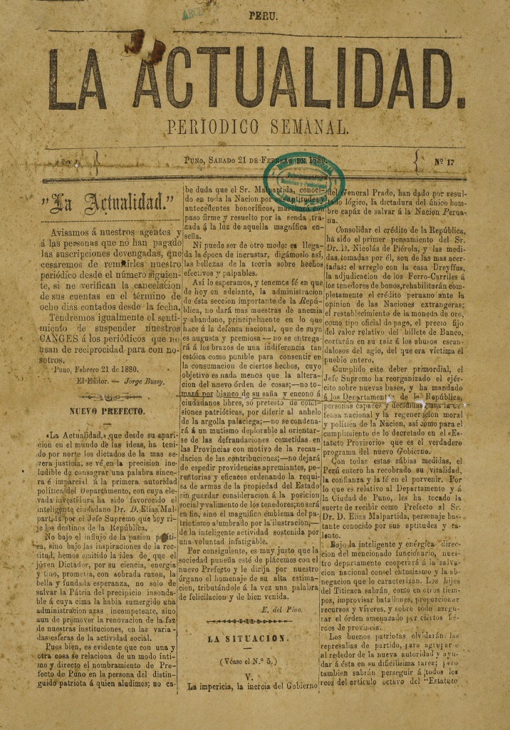 El ejemplar digitalizado por la Biblioteca Nacional del Perú (año 1, nro. 17, 21 feb. 1880) contiene diversas notas periodísticas, correos entrantes y salientes, documentos municipales, entre otros. Resaltan algunos pasajes, como señalamos a continuación. Primero, una nota de E. del Pino titulada “Nuevo prefecto”, referida a la designación de Elías Malpartida como prefecto de Puno. Otra, denominada “La Situación”, en el que el editor resalta el papel de Nicolás de Piérola durante la guerra del Pacífico, cuyo accionar fue el de reorganizar el ejército peruano sobre nuevas bases, mandando a todos los departamentos a personas decididas y comprometidas en salvaguardar la defensa nacional; además, hace un llamado a “los hijos del Titicaca” para que apoyen al prefecto en esta difícil tarea. Se inserta también una “Crónica local”, donde el columnista denuncia el accionar de los civilistas por difamar contra Piérola. Otro documento está dedicado al Tesorero del Concejo Provincial, de quien se presume la malversación de fondos del municipio. Finalmente, en la nota periodística titulada “Sucesos políticos de Huancané”, se informa sobre la protesta del pueblo de Moho por los atentados cometidos por el subprefecto Riveros y sus hijos contra estos ciudadanos.