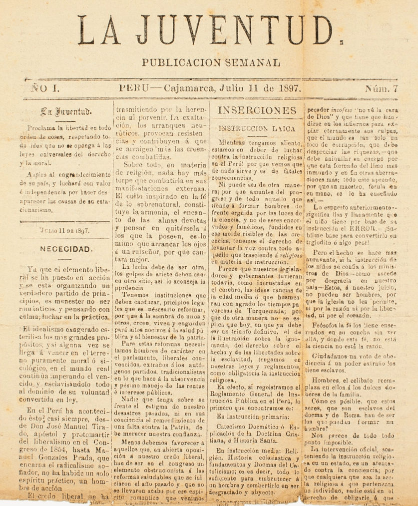 Semanario cajamarquino publicado en 1897 (desconocemos las fechas de su primer y último número). Según señaló sus páginas: «Proclama la libertad en todo orden de cosas, respetando toda idea que no se oponga á las leyes universales del derecho y la moral. Aspira al engrandecimiento de su país, y luchará con valor é independencia por hacer desaparecer las causas de su estacionarismo». El ejemplar digitalizado por la British Library (Año I, nro. 7, 11 jul. 1897) contiene notas sobre el liberalismo y la defensa de la educación laica, el programa conmemorativo de la celebración de la batalla de San Pablo (13 de julio de 1882), entre otros documentos.