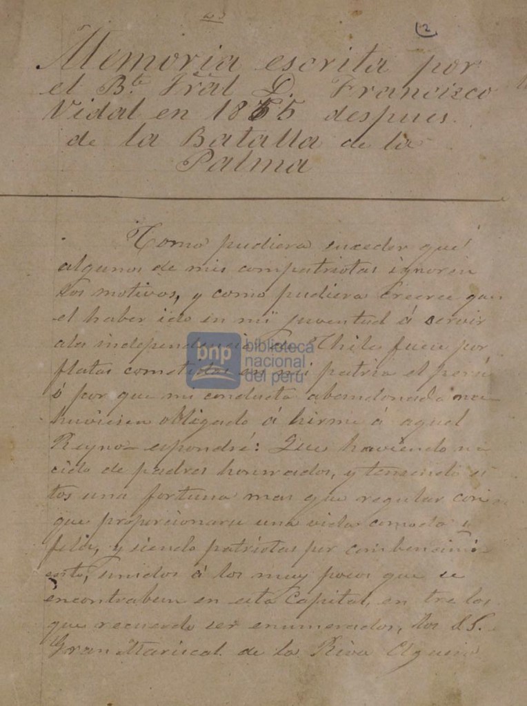 Las memorias del general Francisco de Vidal, cuyo manuscrito original se encuentra custodiado por la Biblioteca Nacional del Perú, son un testimonio histórico de consulta básica para comprender las motivaciones de los actores inmersos en la guerra de independencia peruana. Fueron escritas en 1855, después de la batalla de La Palma. Contiene registros de las batallas militares en las que participó en su vida, y en relación a la independencia resaltan sus “motivos que me obligaron a abrazar la causa de la independencia” y acciones de guerra. Una transcripción del documento ha sido publicada en Fénix: Revista de la Biblioteca Nacional del Perú.