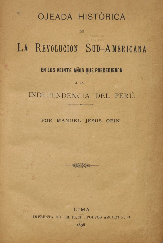 Obín y Charún, M. J. (1896). Ojeada histórica de la Revolucion Sud-americana en los veinte años que precedieron á la Independencia del Perú. Lima: Imprenta de “El País”.