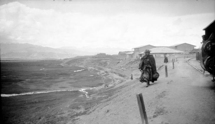 Mujer caminando entre las vías del tren y la planicie húmeda en Ayaviri (Puno, 1930)