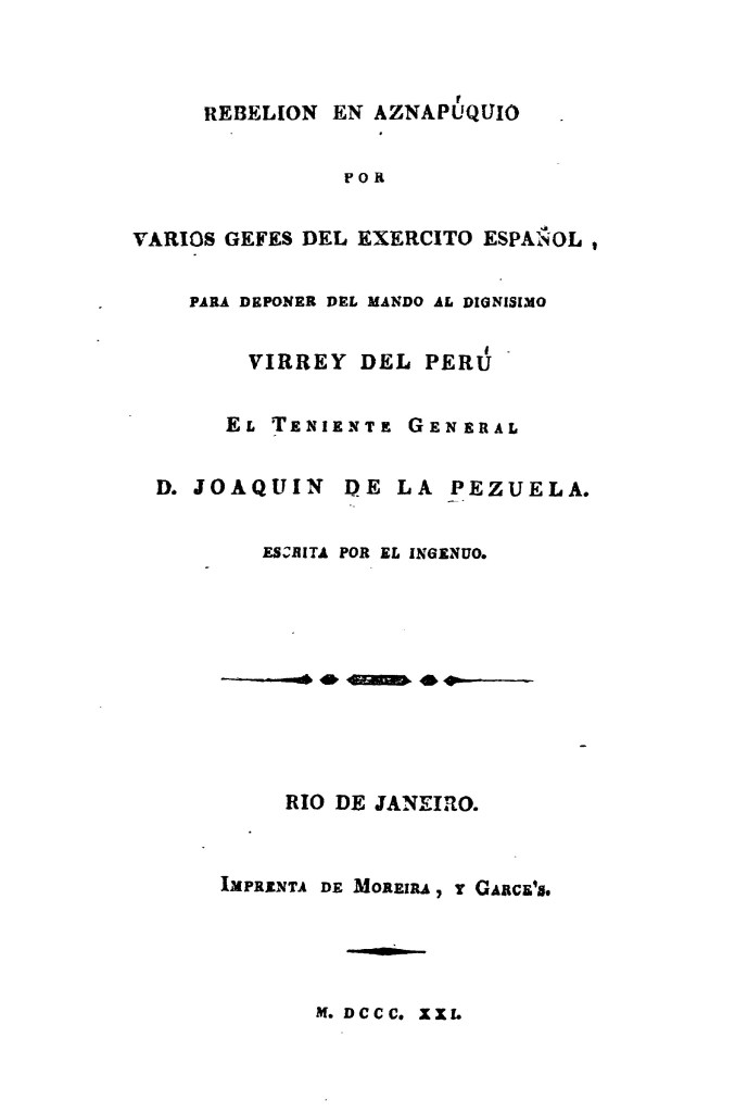 Fernando Zeballos y Pezuela, sobrino del virrey Joaquín de la Pezuela, publicó en 1821 durante su estadía en Río de Janeiro un polémico folleto, titulado Rebelion en Aznapúquio por varios gefes del Exército Español, para deponer del mando al dignisimo Virrey del Perú el Teniente General D. Joaquin de la Pezuela. Este texto fue elaborado en un contexto en el que el virrey Pezuela buscaba cambiar las opiniones respecto a lo que había sido el final de su gobierno, así como también descalificar, a través de diferentes escritos, al nuevo virrey José de La Serna y a sus generales (Peralta, 2014, p. 29). Si bien este folleto no fue elaborado por el mismo virrey Pezuela, tuvo la misma intencionalidad perseguida por el tío del autor: descalificar a la nueva autoridad política del virreinato. Este material resulta interesante pues plasma cómo la rivalidad política durante el contexto de la Independencia se manifiesta en el terreno de los impresos. Se recomienda cautela en su lectura, ya que hay una clara intencionalidad política, lo que hace que pierda cierto margen de objetividad. El folleto fue reimpreso por Manuel del Río en Lima en 1822.