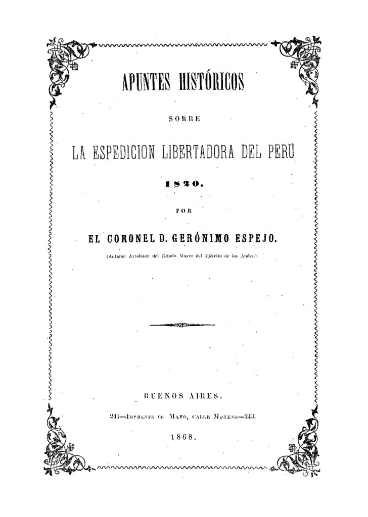 - Espejo, G. (1867). Apuntes históricos sobre la expedición libertadora del Perú, 1820. Buenos Aires: Imprenta y Librería de Mayo. (Acceso 2)