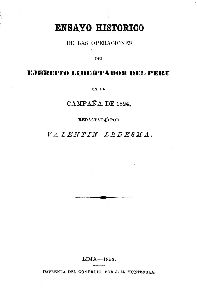 Ledesma, V. (1853). Ensayo histórico de las operaciones del Ejército Libertador del Perú en la campaña de 1824. Lima: Imprenta del Comercio.