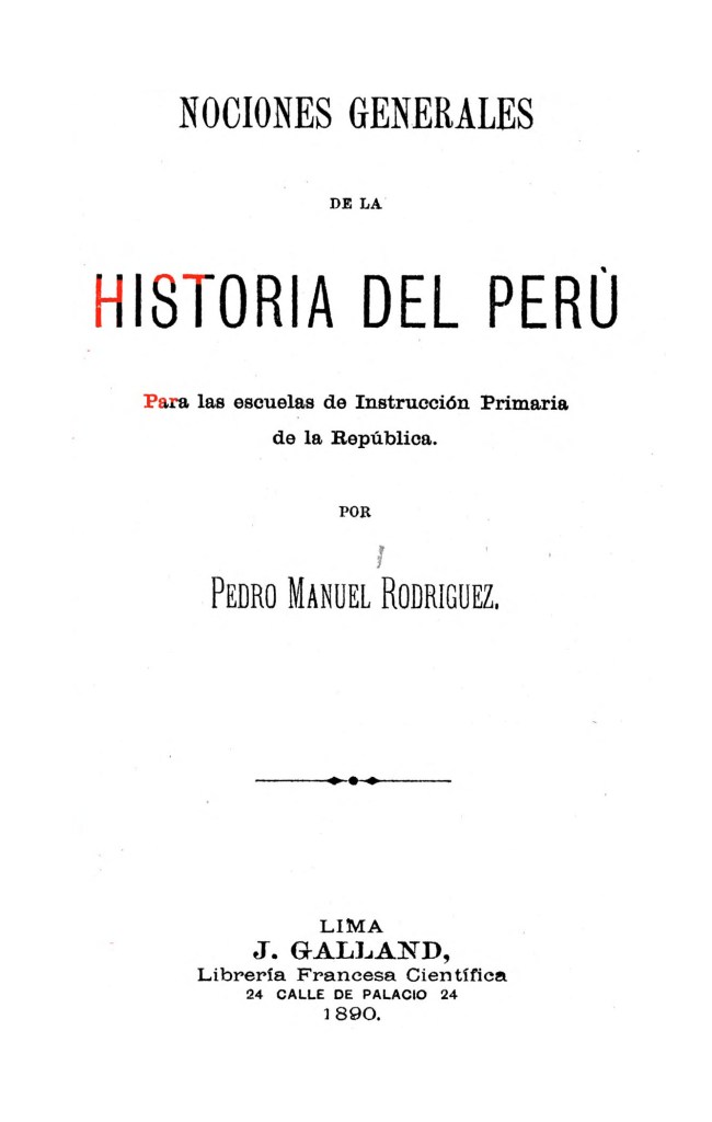 Rodríguez, P. M. (1890). Nociones generales de la Historia del Perú para las escuelas de Instrucción Primaria de la República. Lima: Librería Francesa Científica.