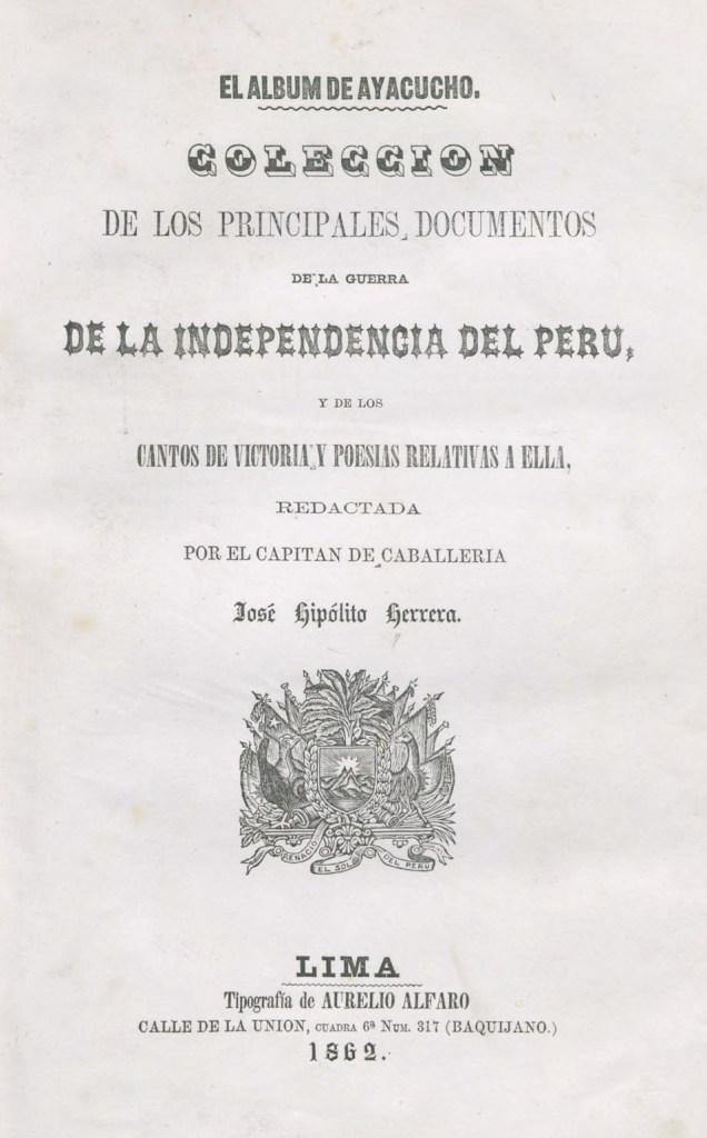 Herrera, J. H. (ed.) (1862). El álbum de Ayacucho: Colección de los principales documentos de la guerra de la independencia el Perú, y de los cantos de victoria y poesías relativas a ella. Lima: Tipografía de Aurelio Alfaro.