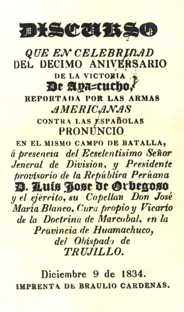 Blanco, J. M. (1834). Discurso que en celebridad del décimo aniversario de la Victoria de Ayacucho reportada por las Armas Americanas contra las españolas pronunció en el mismo campo de batalla, a presencia del Excelentísimo Señor General de División, y Presidente provisorio de la República Peruana D. Luis José de Orbegoso y el ejército, su Capellán Don José María Blanco, Cura propio y Vicario de la Doctrina de Marcabal, en la Provincia de Huamachuco, del Obispado de Trujillo [en] Diciembre 9 de 1834. [Ayacucho]: Imprenta de Braulio Cárdenas.