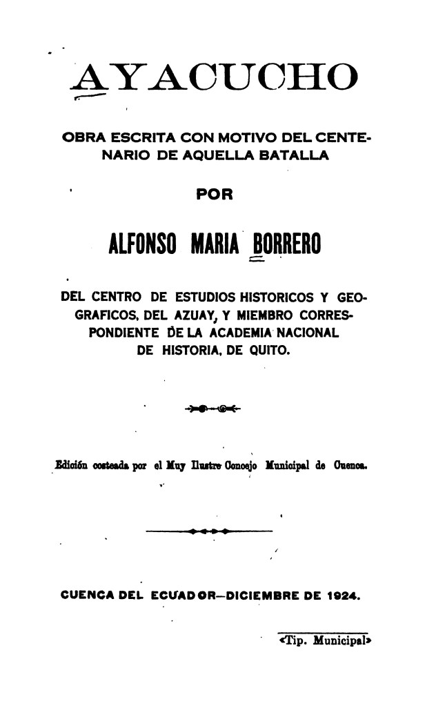 Borrero, Alfonso María (1924). Ayacucho. Obra escrita con motivo del Centenario de aquella batalla. Ecuador: Tip. Municipal.