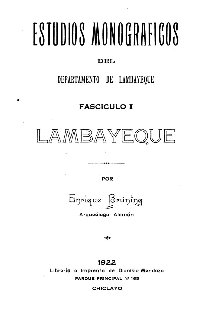 Brüning, Enrique (1922-1923). Estudios Monográficos del Departamento de Lambayeque. 4 fascículos. Chiclayo: Librería e Imprenta de Dionisio Mendoza.