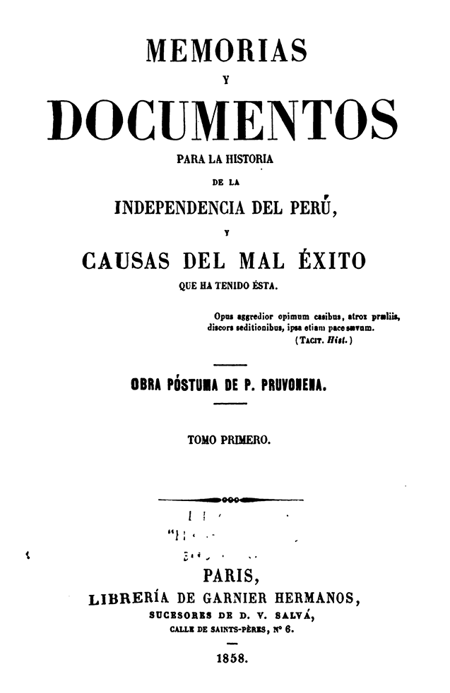 - Riva Agüero, José de la (1858). Memorias y documentos para la historia de la independencia del Perú, y causas del mal éxito que ha tenido ésta. 2 vols. París: Librería de Garnier Hermanos.