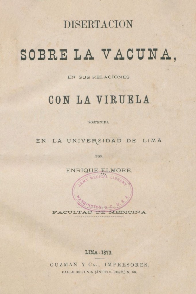 Disertación ofrecida por Enrique Elmore en Universidad San Marcos el 18 de mayo de 1873 sobre la importancia del empleo de la vacuna contra la lucha contra la viruela, en un contexto donde aún existía un alto rechazo de parte de la población peruana hacia la inoculación, pero también una reaparición recurrente de la viruela en forma epidémica, tanto en la capital como en el interior del país. Al respecto, señala que: