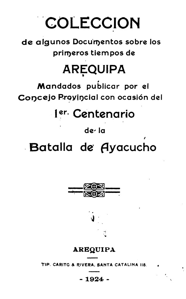 Cabrera Valdés, Manuel Ladislao (1924). Colección de algunos Documentos sobre los primeros tiempos de Arequipa, mandados publicar por el Concejo Provincial con ocasión del 1er Centenario de la Batalla de Ayacucho. Arequipa: Tip. Caritg & Rivera.