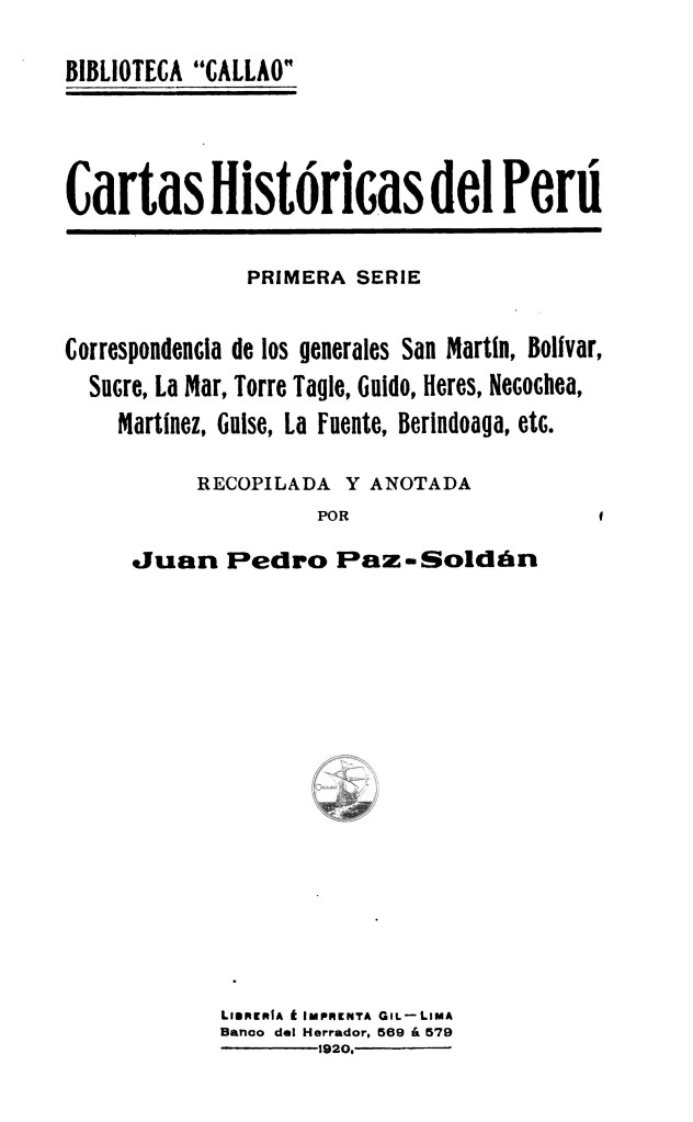 Entre 1920 y 1921 Juan Pedro Paz Soldán recopiló y publicó una serie de correspondencias de personajes ligados a la independencia del Perú, con el objetivo de “desvelar la niebla que envuelve a las personalidades y a los acontecimientos de la década de 1819-1829 y a reparar injusticias y olvidos lamentables”. Apareció en dos volúmenes bajo el título de Cartas Históricas del Perú, y formó parte de lo que denominó “Biblioteca Callao”.