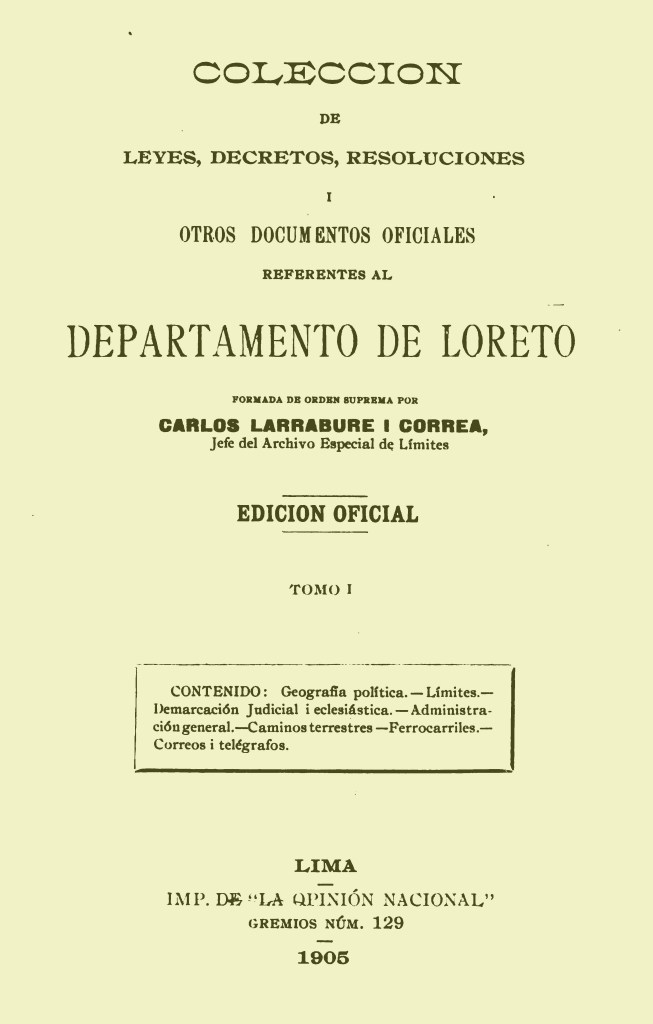 Importante recopilación documental publicada por Carlos Larrabure y Correa entre 1905 y 1907-1909 (18 vols.), mientras se desempeñaba como jefe del Archivo Especial de Límites del Ministerio de Relaciones Exteriores. Según su comentario introductorio, el objetivo de la obra era «dar á conocer la acción de los poderes públicos en el departamento de Loreto», para así «valorar lo mucho que en todo tiempo ha hecho nuestro gobierno en pró de ese importante departamento» (Larrabure, 1905, t. I, p. iii). Inserta reales cédulas, leyes, decretos, resoluciones, oficios, nombramientos, instrucciones, informes, correspondencias, ensayos oficiales y académicos, entre otros documentos de interés para el estudio de la región Loreto y San Martín entre finales del siglo XVIII e inicios del XX.
