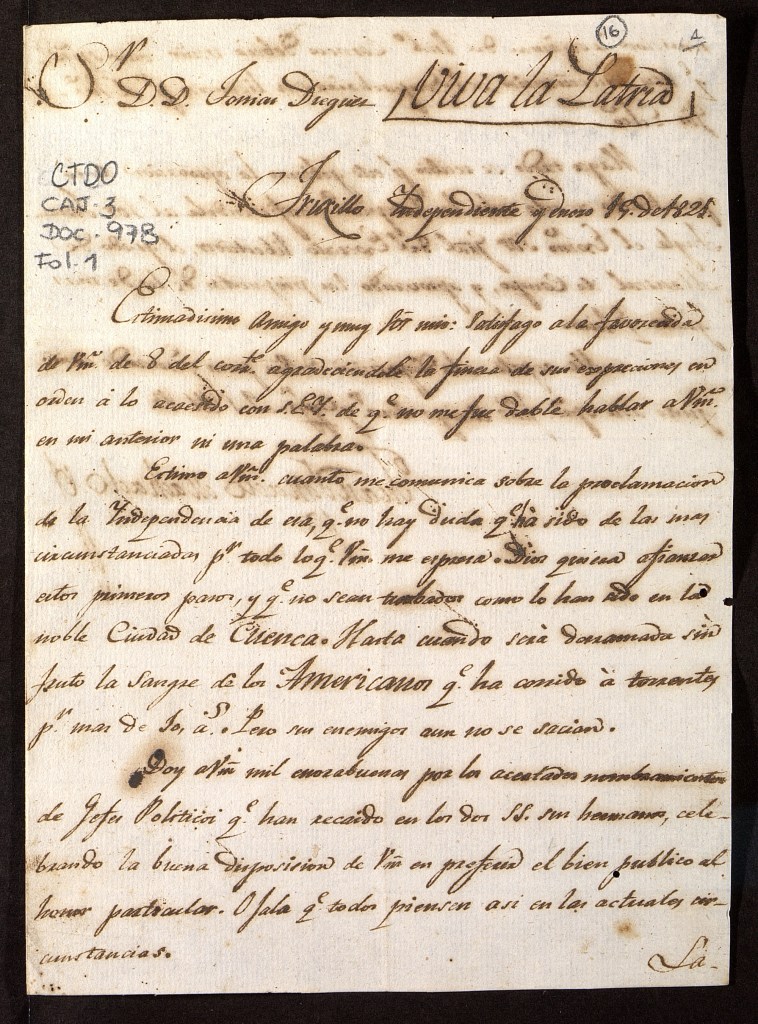 Correspondencia de Juan Ignacio Machado a Tomás Diéguez sobre proclamación de Independencia en Trujillo, 1821.