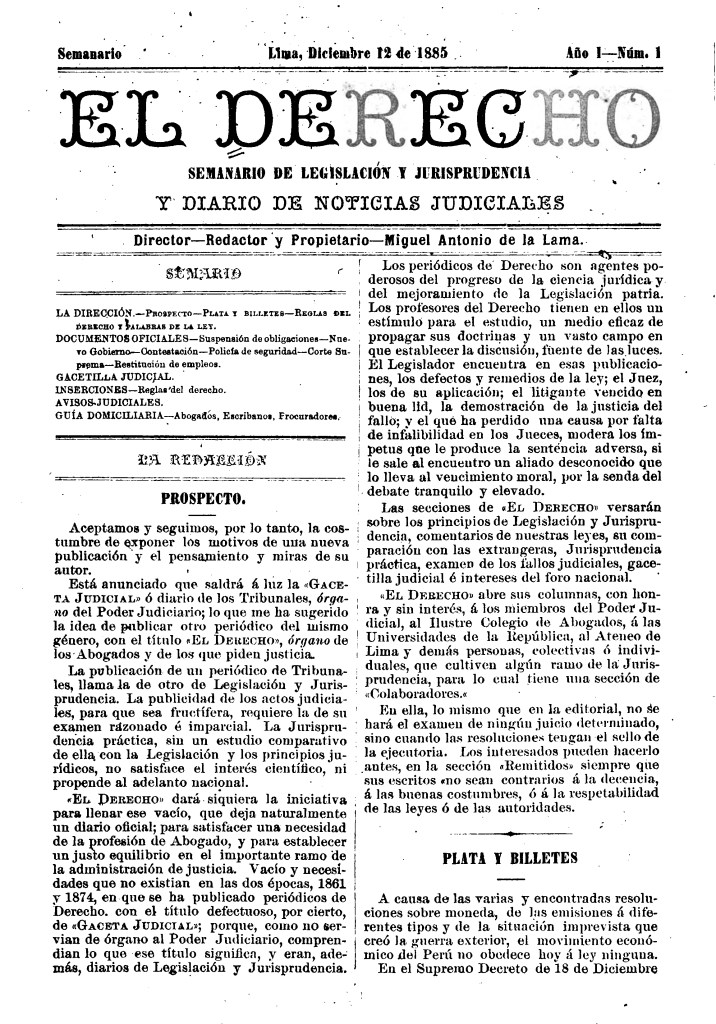 Revista limeña aparecida en diciembre de 1885 bajo el nombre de El Derecho: Seminario de legislación y jurisprudencia y diario de noticias judiciales. Según su prospecto, surgió para transformarse en «el órgano de los Abogados y de los que piden justicia», buscando llenar el vacío dejado por periódicos oficiales como la Gaceta Judicial en materia del derecho. Tuvo como director, redactor y propietario a Miguel Antonio de Lama, reconocido abogado de la época, autor de compendios económicos como Legislación mercantil del Perú (Lima, 1869, 3 vols.). Insertó documentos oficiales, gacetillas, estudios y avisos judiciales, guía domiciliaria de abogados, escribanos y procuradores, entre otros. Posteriormente, se transformó en el órgano del Ilustre Colegio de Abogados de Lima. El Derecho se publicó al menos hasta 1909.