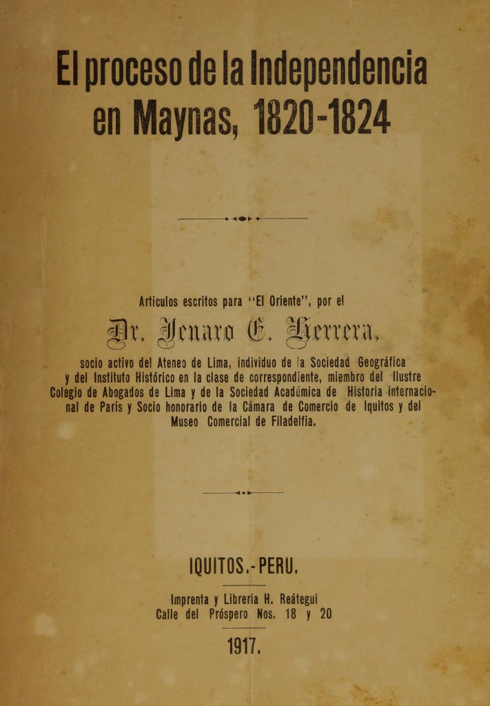 Herrera, Jenaro Ernesto (1917). El proceso de la Independencia en Maynas, 1820-1824. Iquitos: Imprenta y Librería H. Reátegui.